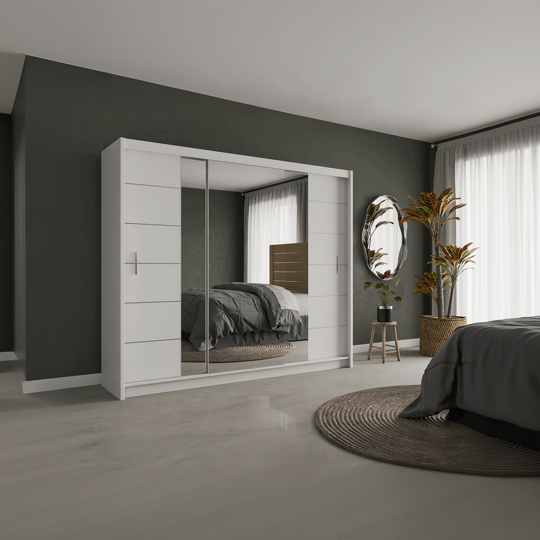 The smooth, silent sliding door system maximises floor space while ensuring quiet operation. Finished with elegant panelled doors and matte silver-effect handles, this wardrobe blends modern style with long-lasting durability.